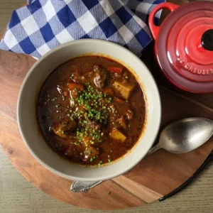 Gulasch is a staple in German cuisine, bridging the gap between its Hungarian origins and the hearty, comforting dishes that define German home cooking. Walk into almost any Brauhaus (brewery restaurant) or Gasthaus (inn) in Germany, and you’re likely to find Gulasch on the menu, especially in the colder months. While its roots are firmly planted in Hungary, German chefs and home cooks have embraced this dish, adapting it with regional twists and ingredients. The addition of potatoes, as in this recipe, is a nod to the practicality and resourcefulness of German cooking, where one-pot meals are designed to be both satisfying and efficient.